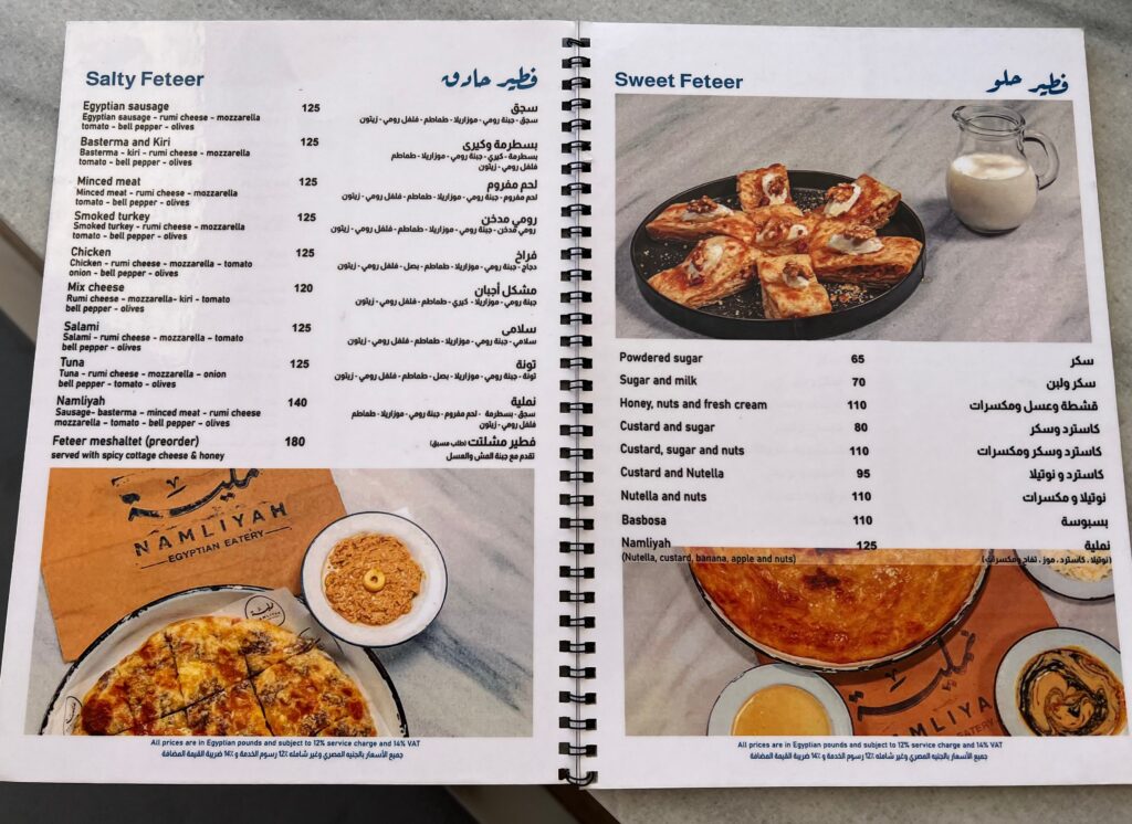 Das Namliyah – Egyptian Eatery – auf der Al Dau Promenade in Hurghada ist ein wahrer Geheimtipp und ein Muss für alle, die auf der Suche nach authentischer ägyptischer Küche, im schicken Ambiente sind. Das Restaurant hat sich auf das Traditionsgericht Fetter fokussiert, hat aber dennoch eine kleine Auswahl an typisch ägyptischen Frühstücksspeisen. Feteer meshaltet, oft einfach als Feteer bezeichnet, ist ein flockiges ägyptisches Schichtgebäck. Es besteht aus vielen dünnen Schichten Teig und Ghee. Optional gibt es diese auch mit einer süßen oder herzhaften Füllung.